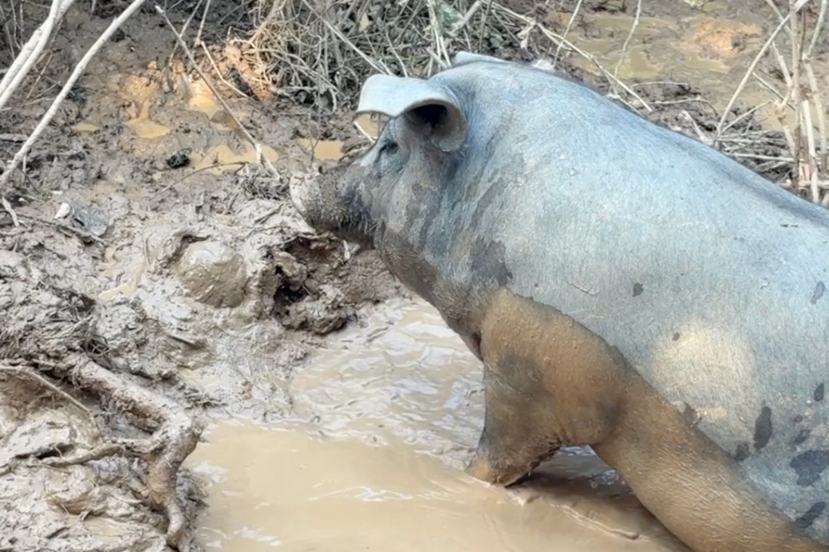 Our pigs look muddy, and they are — but for a very good reason. Pigs cannot sweat. They have no sweat glands, so rolling in mud is their natural cooling system. It keeps their body temperature down, protects them from insects, and acts as a natural sunscreen. The mud is not a sign of dirty living — it’s a sign of healthy, self-regulating animals doing exactly what they’re supposed to do.